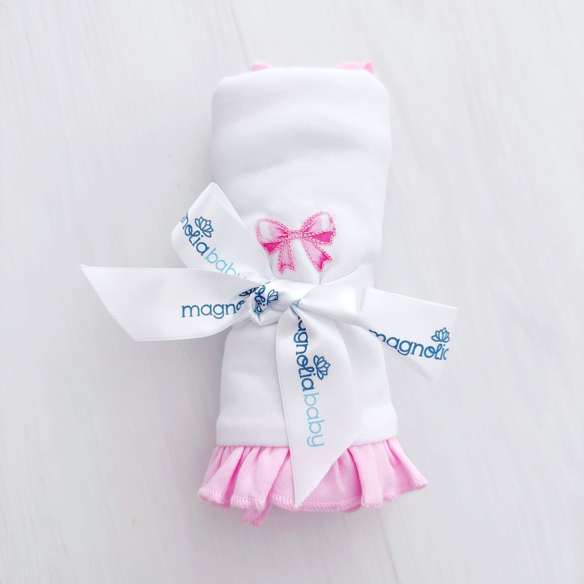 Keep your baby girl clean and stylish with the Magnolia Baby Ruffle Burp Cloth from the adorable Baby Bows collection. This charming burp cloth features a delicate pink ruffle trim and a dainty embroidered bow. Key Features: Delicate Pink Ruffle Trim: Adds a touch of feminine charm that perfectly complements the Baby Bows collection Embroidered Bow Detail: A sweet and subtle accent that enhances the burp cloth’s design Soft & Absorbent Pima Cotton: Gentle on baby’s sensitive skin and effectively catches messes Generous Size: Provides ample coverage for spills and dribbles Magnolia Baby Quality: Expertly crafted for lasting durability and frequent use Perfect for: Mealtime messes and spills Protecting clothing during feeding or playtime Baby showers and new baby gifts Coordinating with other Baby Bows