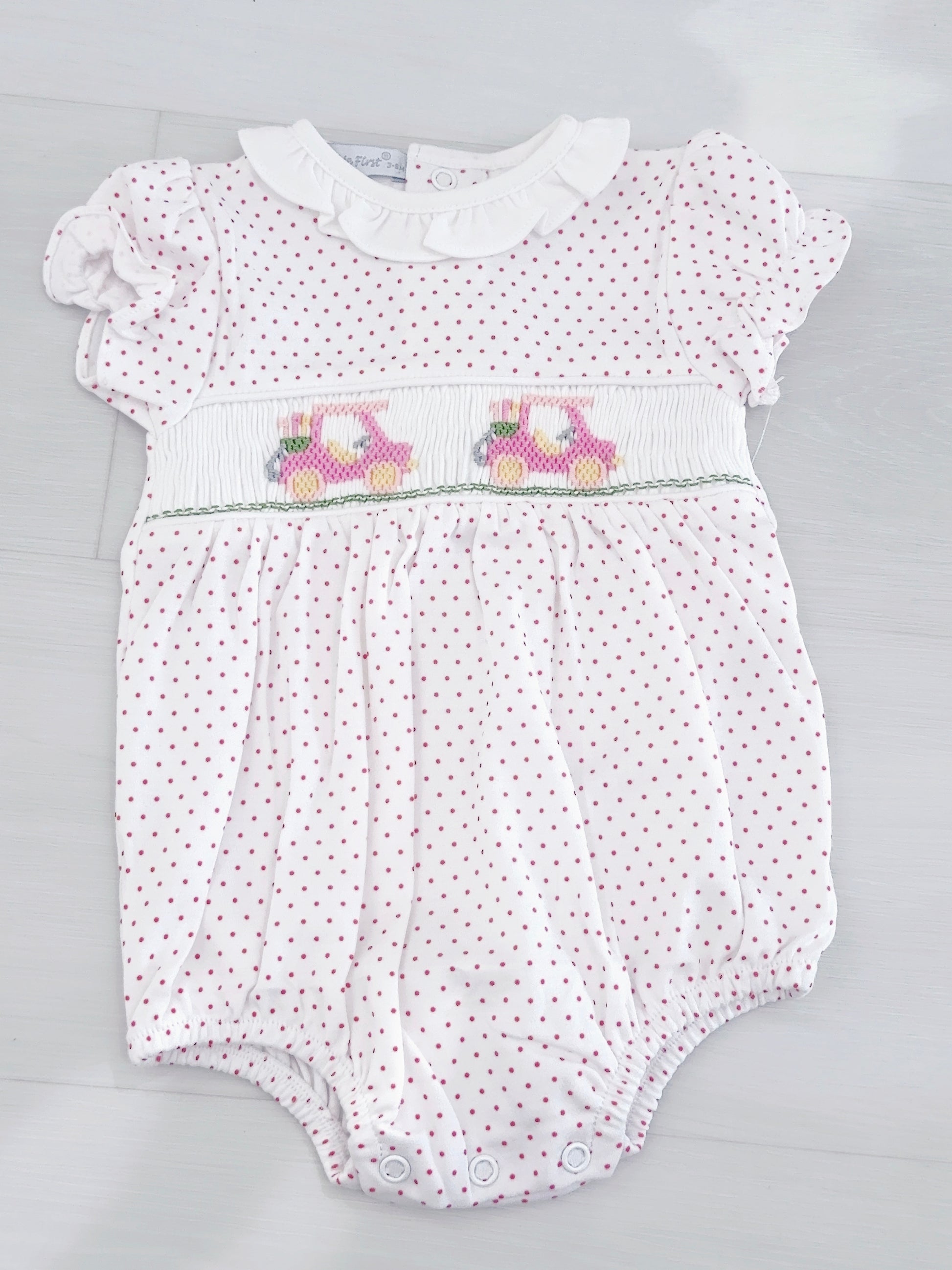 Pink Golf Hand Smocked Pima Bubble is a must-have for your little one's wardrobe. Designed by Hug Me First, this bodysuit is crafted from 100% Pima cotton, known for its softness and durability, ensuring a gentle hug on your baby's delicate skin. Perfect for everyday wear in the spring and summer seasons, this bodysuit is also machine washable, making it easy to keep clean and fresh. Its hand-smocked design adds a unique touch, making your baby stand out in style.