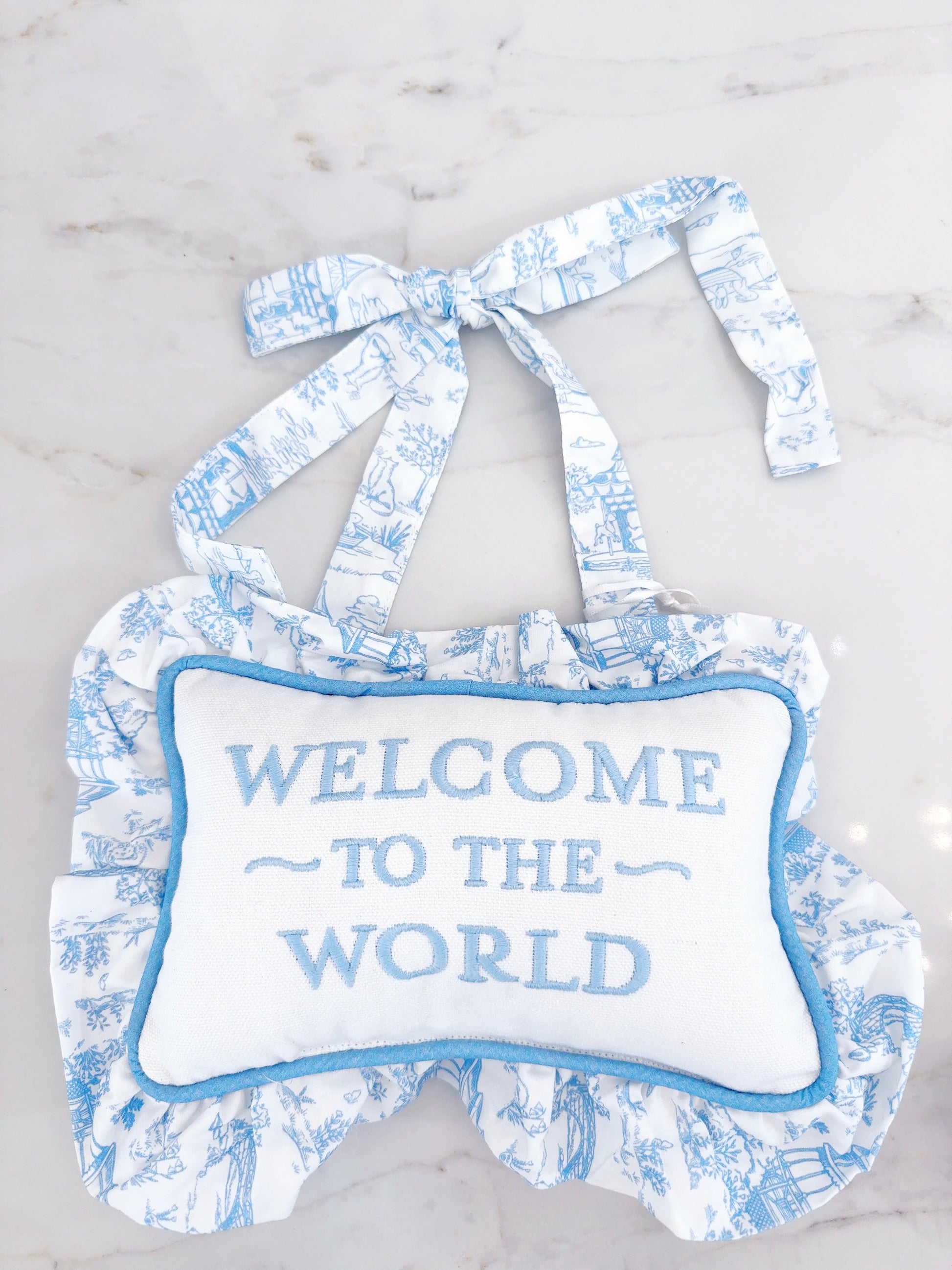 Welcome to the World Door Hanging Pillow- Blue Toile